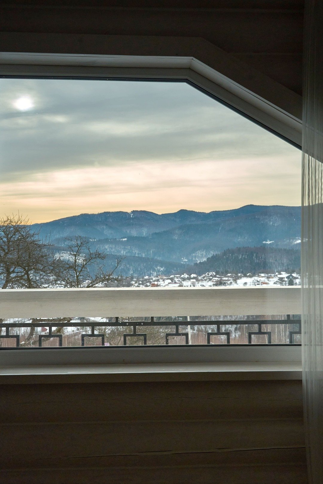 On the first floor there is a kitchen with a large dining table and all necessary amenities. There is also the largest room in the house, where there is a king-size bed. This is the main feature of our cottage, because it is from this room that the panorama of the Gorgana ridge opens.